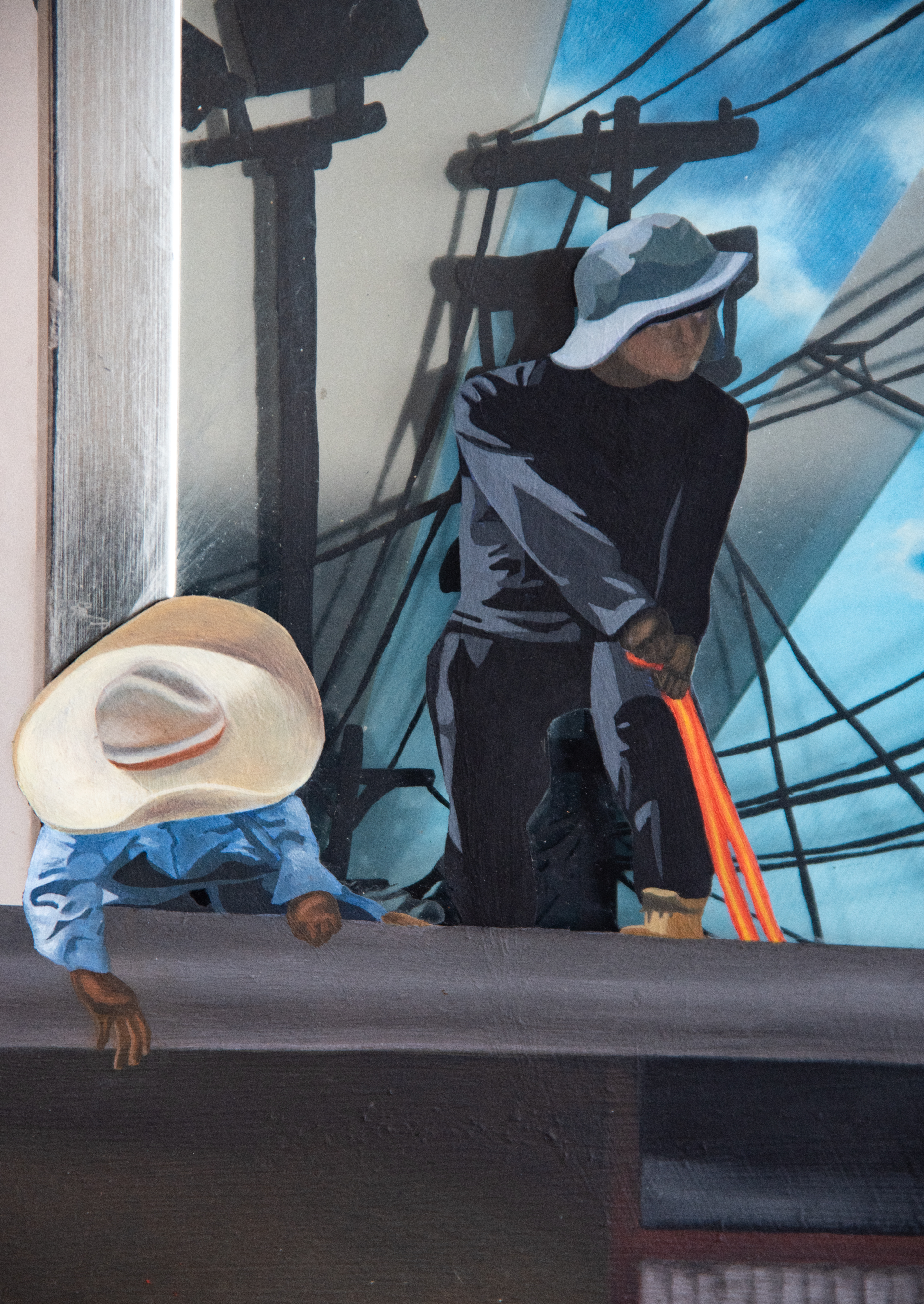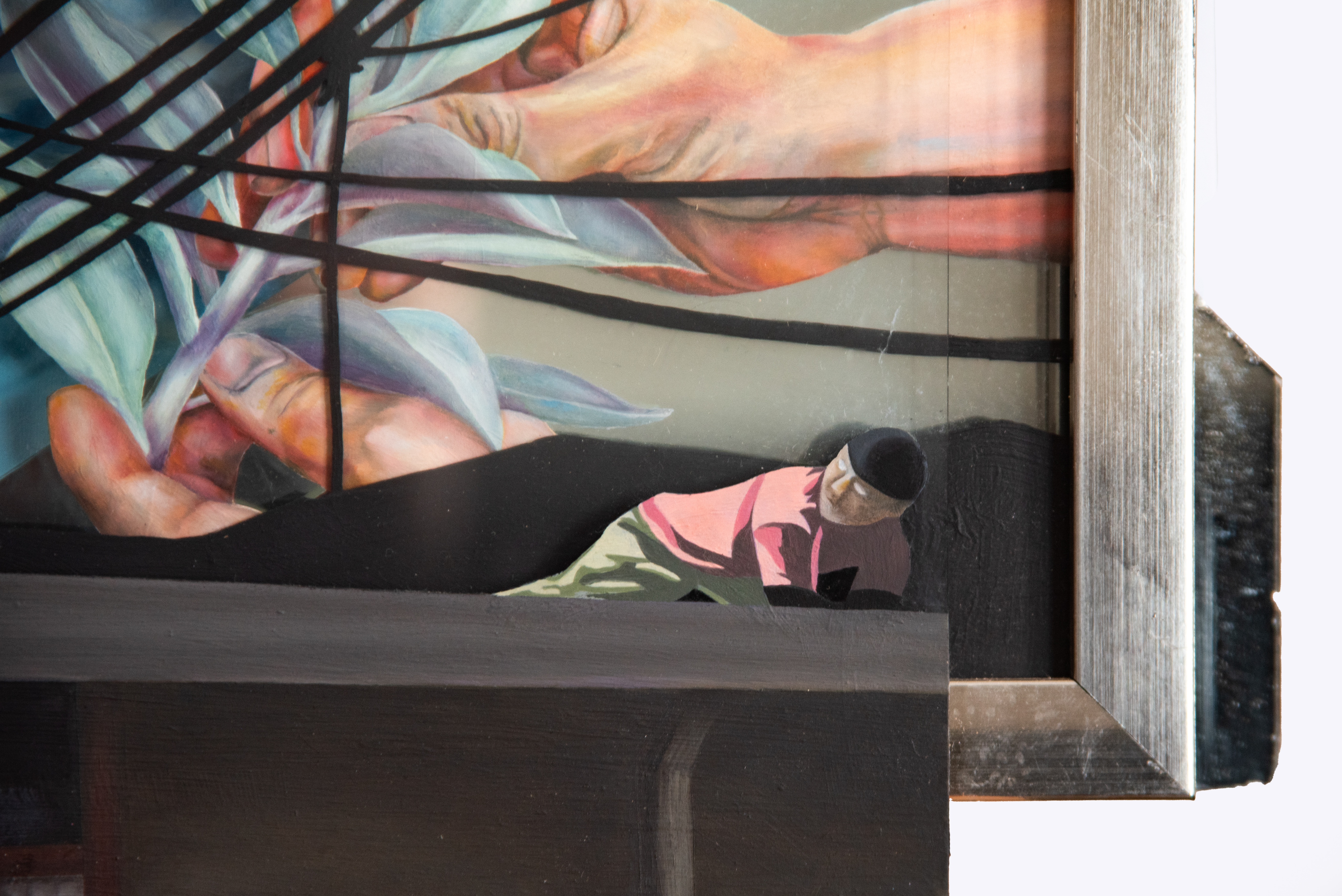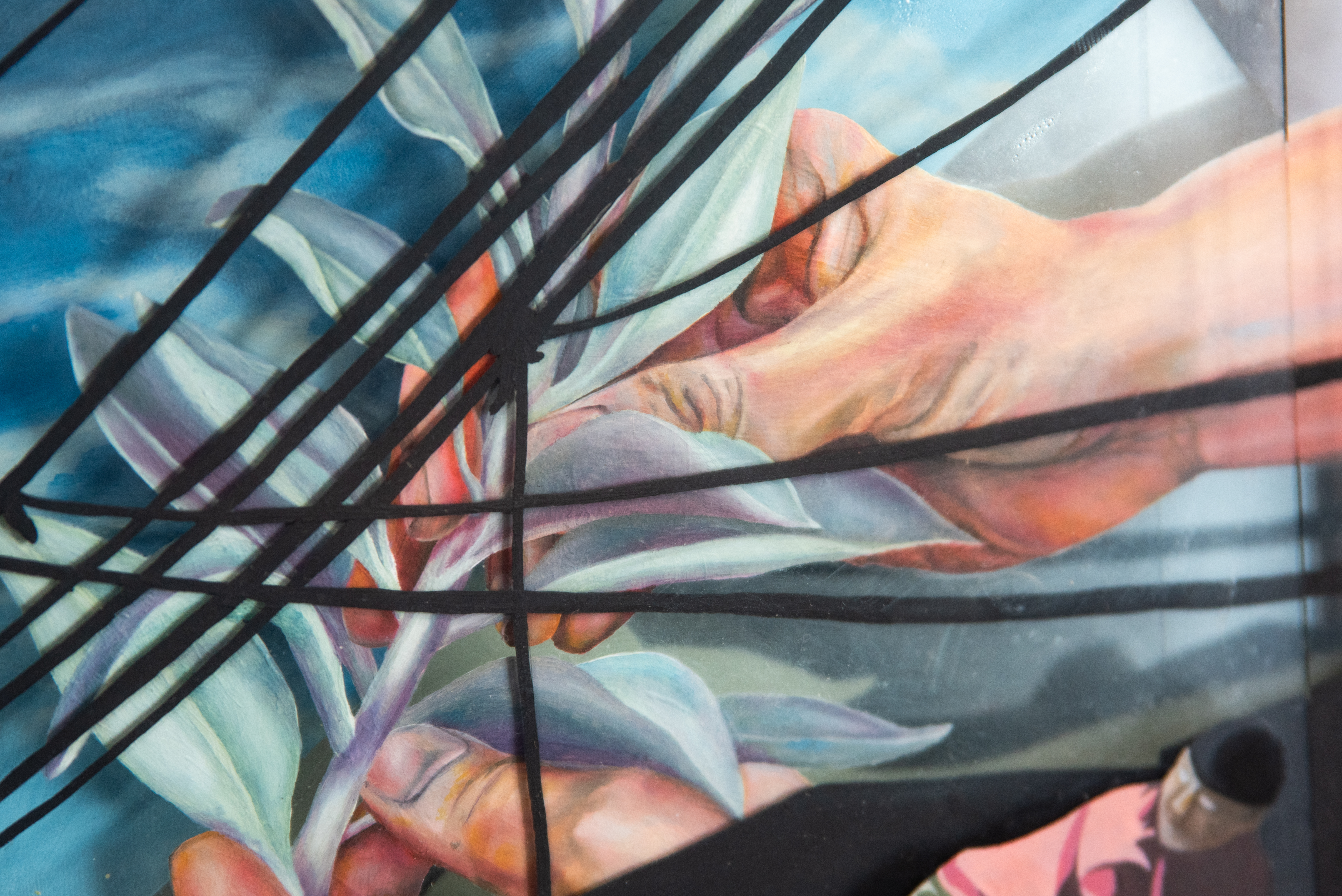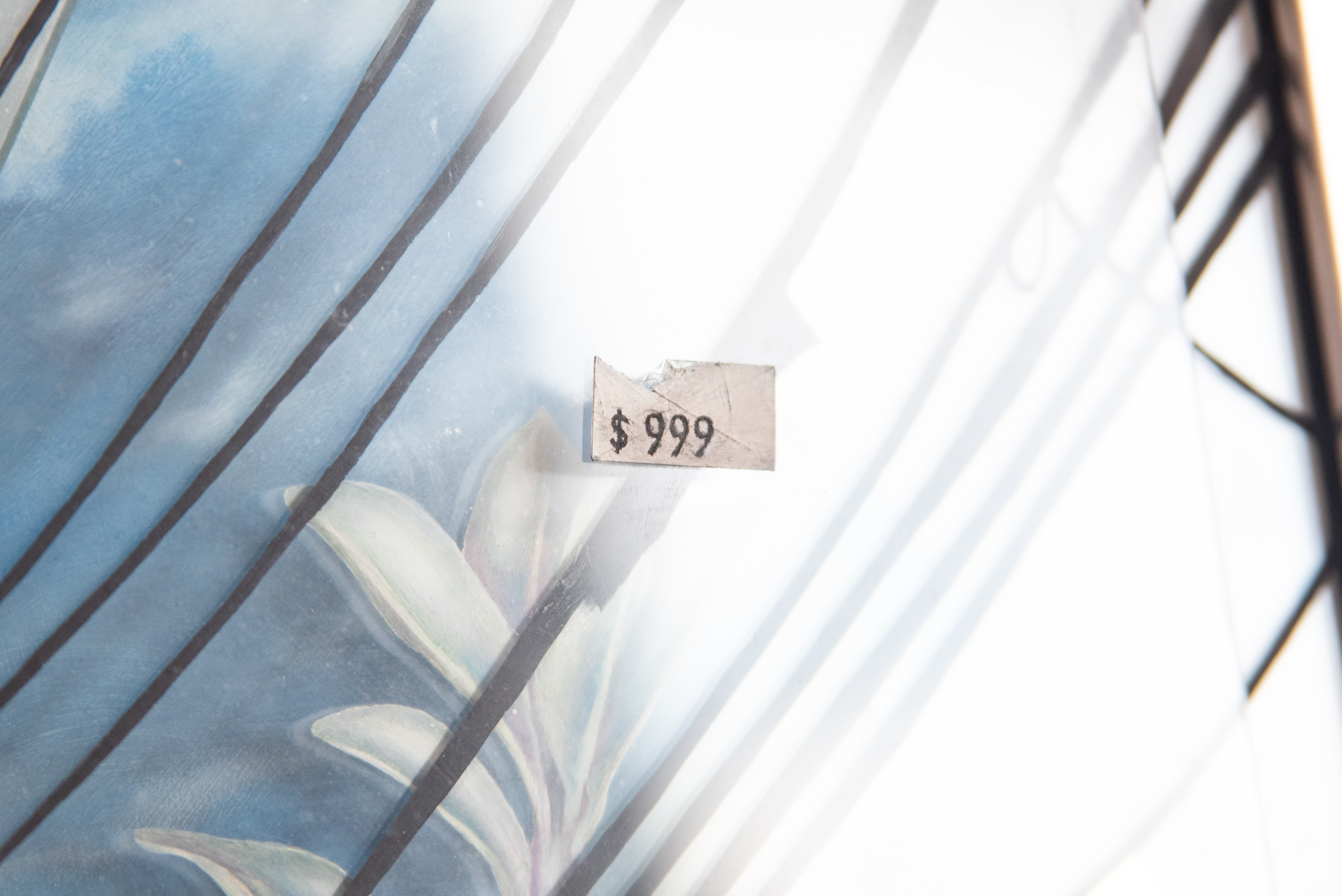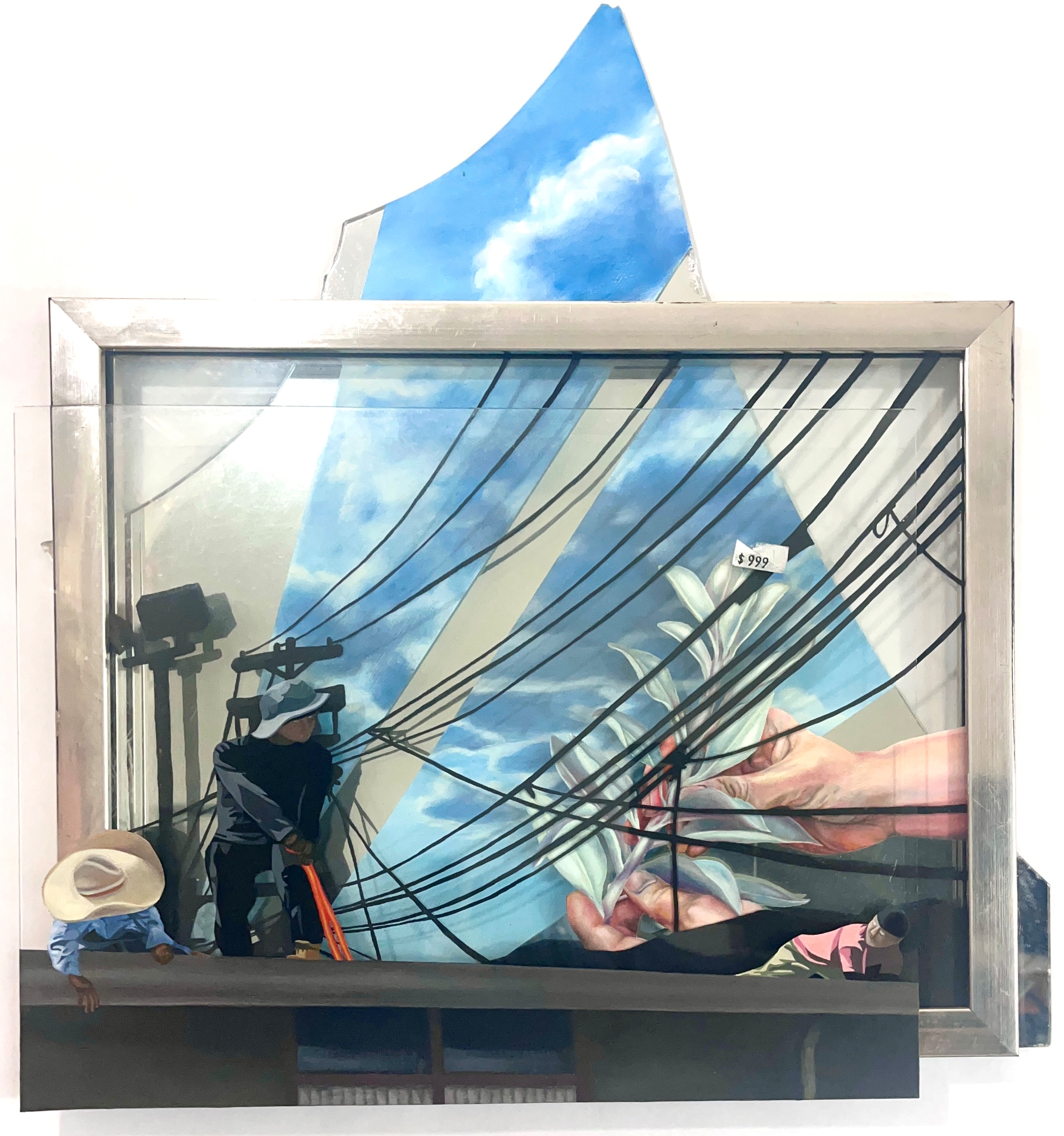 This piece explores the delicate balance between intention and the products of our labor, contrasting mindful creation with forced, impersonal work. The hands of a man carefully bending a sprig of sage reflect a moment of quiet harmony, where creation is rooted in care and respect for the natural world. This act of gentle, purposeful creation stands in stark contrast to the man wielding the harsh orange tool, whose task is to construct an uninspired, ugly building driven by the pressures of monetary gain. The disconnect between these two forms of labor is emphasized by the contrasting hues: the vibrant blue sky above, full of natural beauty, juxtaposed with the orange tool, a symbol of utilitarian work devoid of meaning. To further complicate this narrative, I’ve depicted a price tag on the painting itself, prompting me to reflect on my own place within this cycle of creation and commerce. As I have through this work, I invite the viewer to reflect on the cost of their own contributions, urging a reconsideration of how we create and what legacy we choose to leave—one that is meaningful, not just priced to sell.
