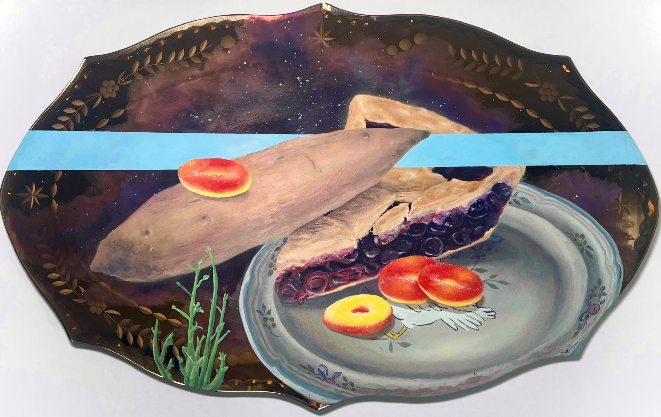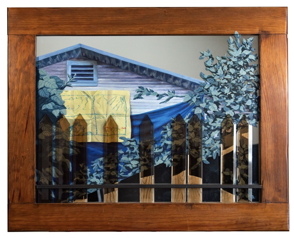 Shakespeare’s iconic question, “What’s in a name?” prompts us to consider the complexities of identity. In this piece, I explore how the names I am referred to in my new home reflect the circumstances that shaped my sense of self within this environment. The home is symbolized by a beloved plate, which is shown encouraging me to suspend myself in water, represented by a vibrant blue line. This act is significant, as it mirrors the growth of a sweet potato—a name I hold dear—which thrives in water as its first sprouts emerge. Through this imagery, I invite viewers to consider how identity, growth, and belonging are deeply intertwined.